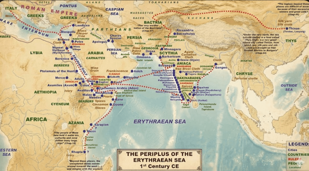 - Exports from India: Ivory, silk, cotton cloth, long pepper, spikenard, and precious stones like agate and carnelian.